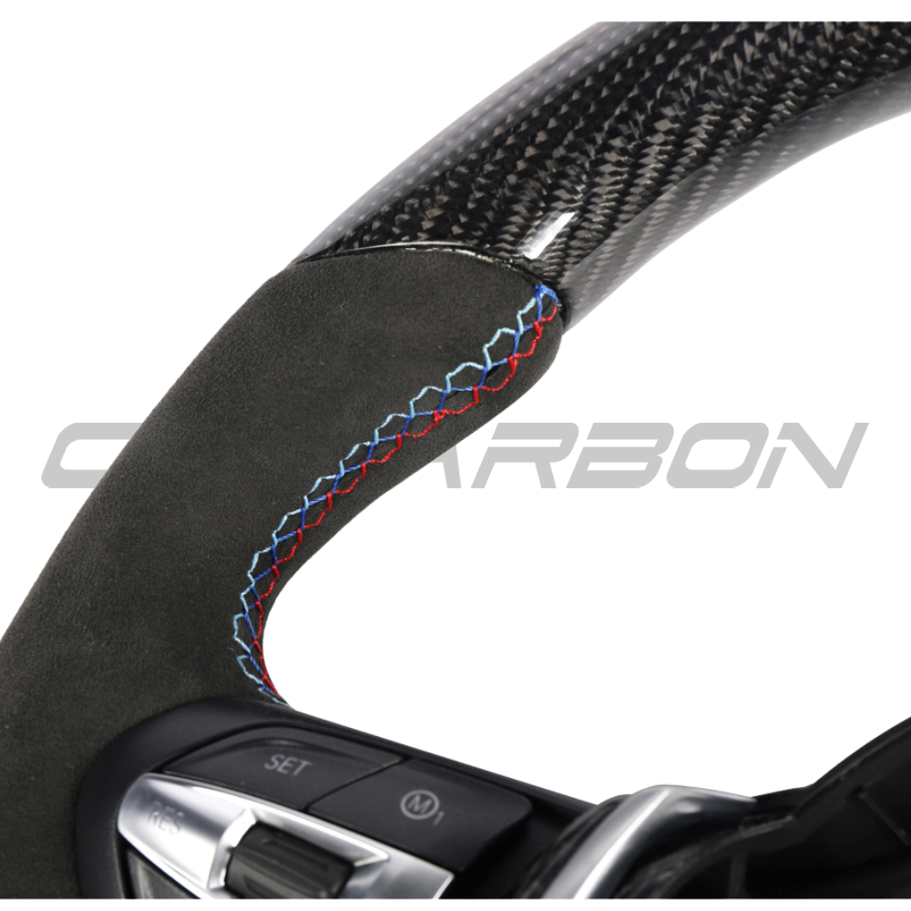 Upgrade your BMW with the BMW FXX Carbon Fibre & Alcantara Flat Bottom Custom Steering Wheel by CT Carbon. This custom wheel features Carbon fibre, Alcantara and a flat bottom construction offering a transformative modification for your interior and driving experience.