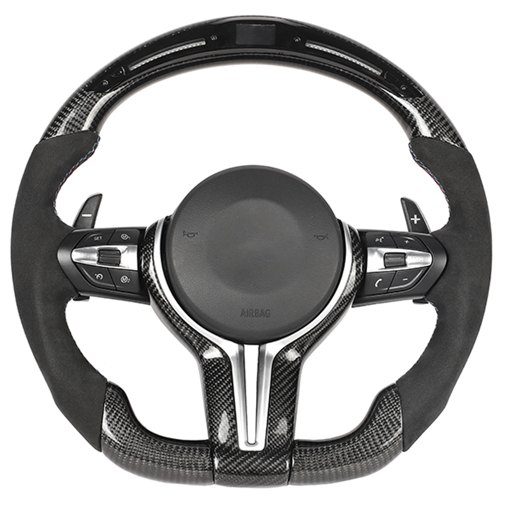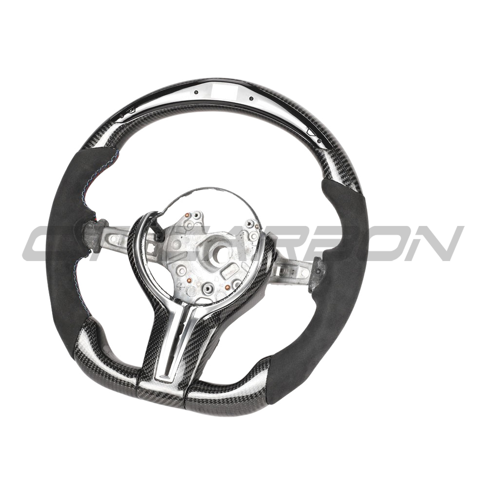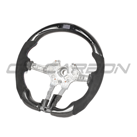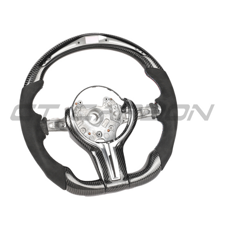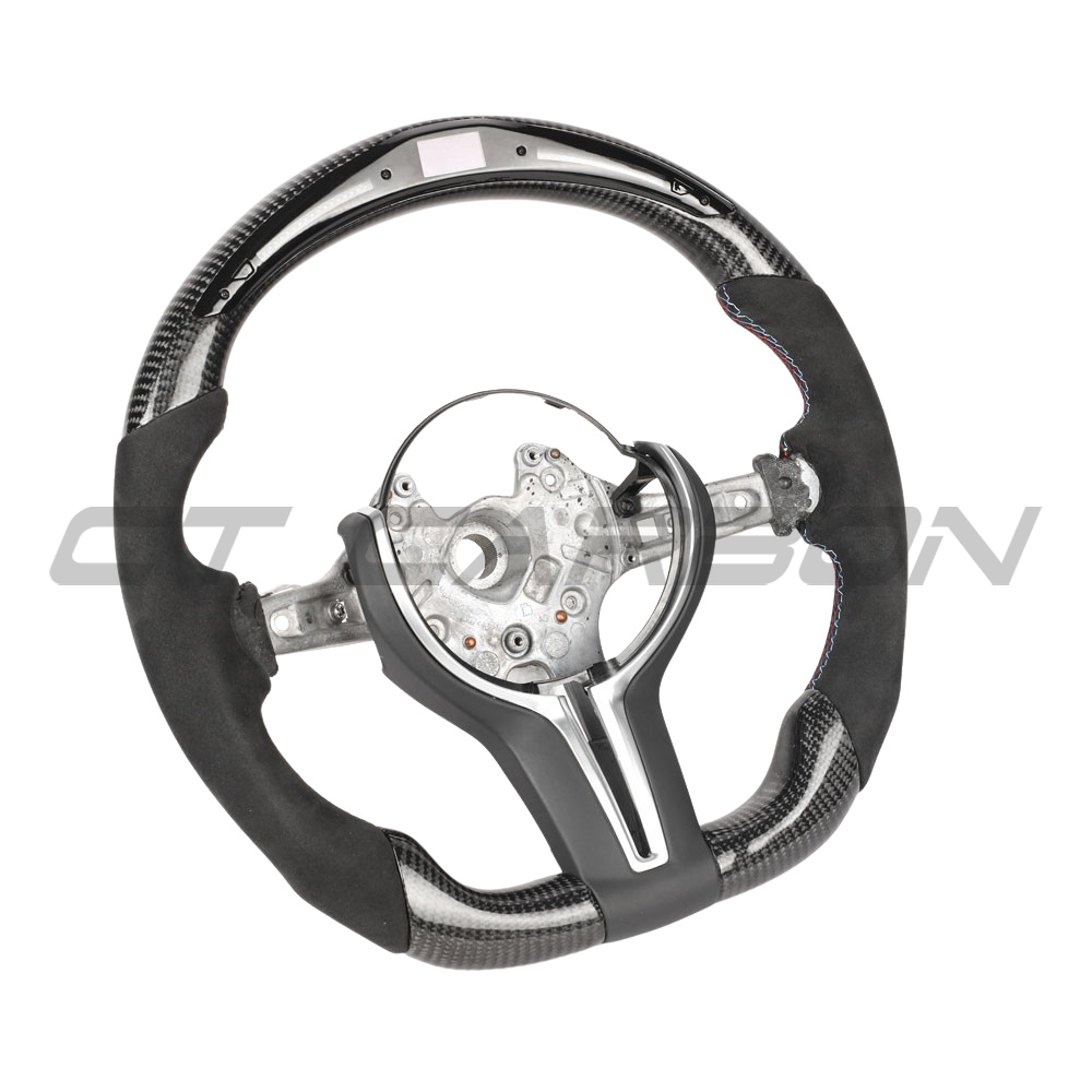 Customize your BMW with the BMW FXX Carbon Fibre, Alcantara & LED Flat Bottom Custom Steering Wheel by CT Carbon, a transformative modification for the interior of your vehicle that you can add a personal touch to.