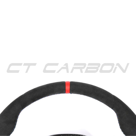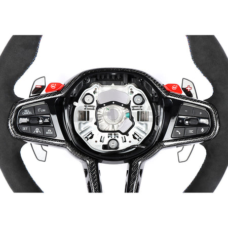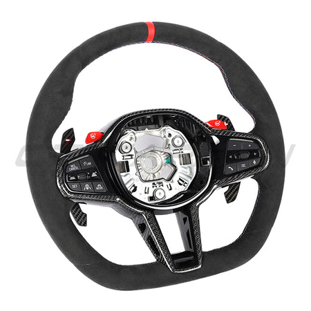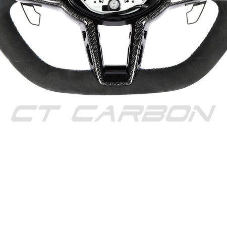 Customize your BMW with the BMW GXX LCI Alcantara Flat Bottom Custom Steering Wheel by CT Carbon, a transformative modification for the interior of your vehicle that you can add a personal touch to.