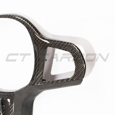 CT Carbon steering wheel trim, made from high-quality carbon fibre, finished in a high gloss with alcantara. Made to fit various BMW models as listed below.