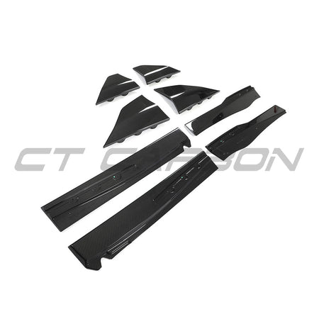 Full CT Carbon side skirts designed in-house for the Mclaren 720S. These side skirts are made up of two pieces, made from high-quality; double skinned, pre-preg carbon fibre.