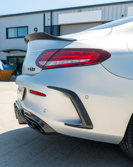 CT Carbon rear bumper canards for the W205 C63 AMG. Although a seemingly small modification, they will transform how wide the car looks from the rear.